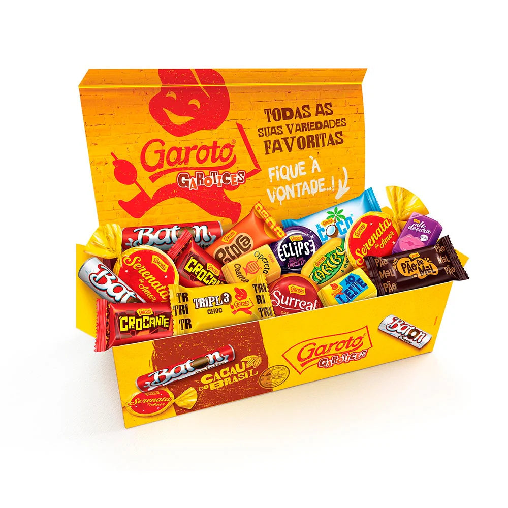 Alguns dos melhores chocolates Garoto, como Surreal, Caramelo e Crocante estão entre outros que você vai encontrar ao abrir a caixinha amarela.